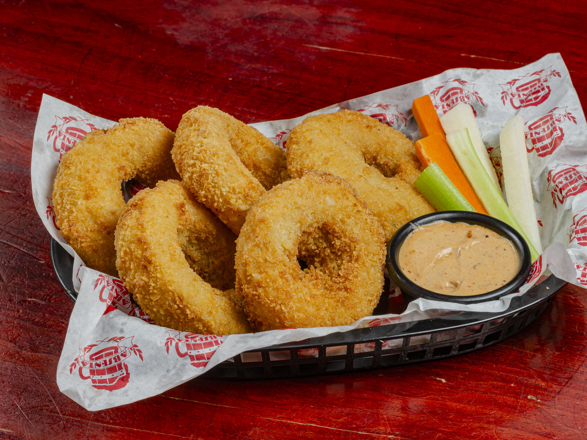 Aros de cebolla empanizados, rellenos de queso Monterrey Jack, con pomodoro y aderezo spicy. (5 pzas.)