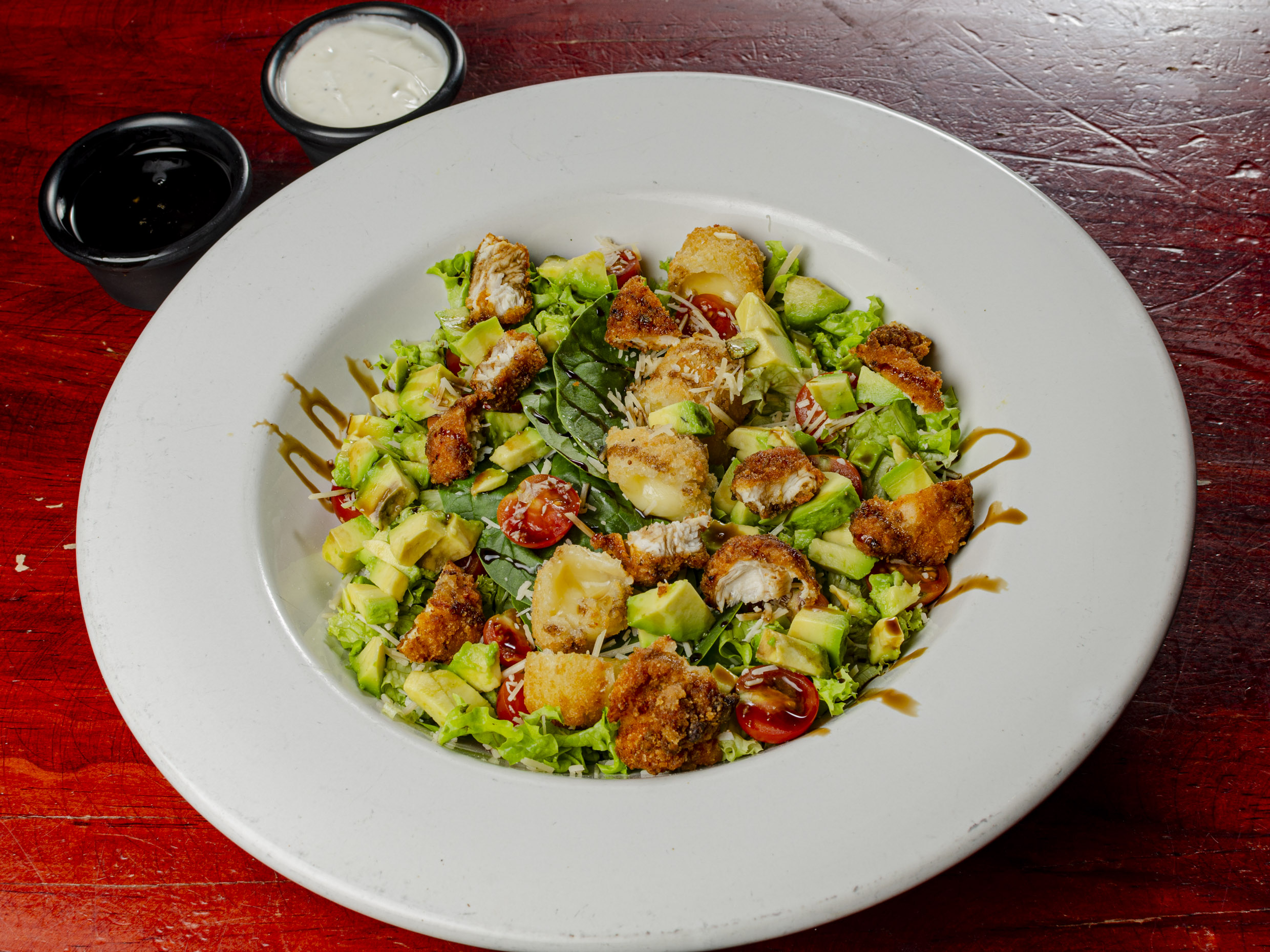 Mix de lechuga, dedo de queso, tender, aguacate, tomate cherry, aderezo ranch y Jack Daniel's.