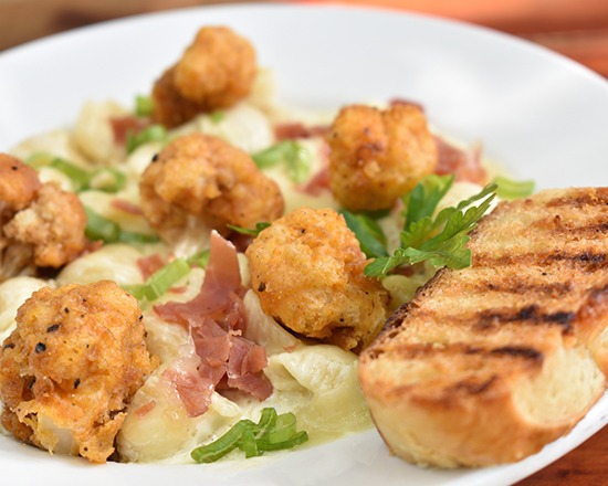Pasta caracol, con salsa tres quesos, acompañada de coliflor frita.