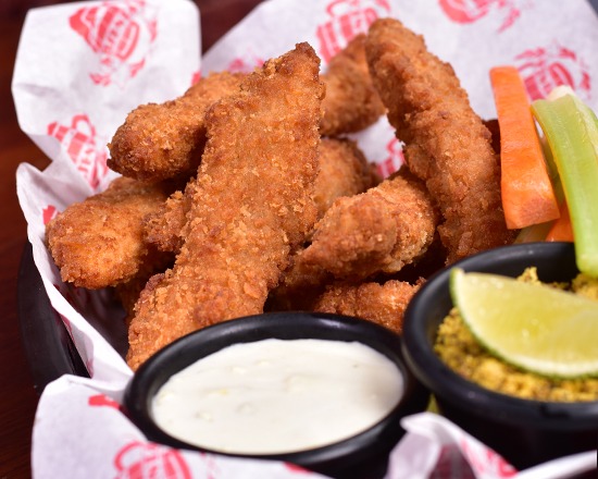 450 g de crujientes tiras de pechuga de pollo empanizadas, acompañadas del aderezo de tu preferencia.