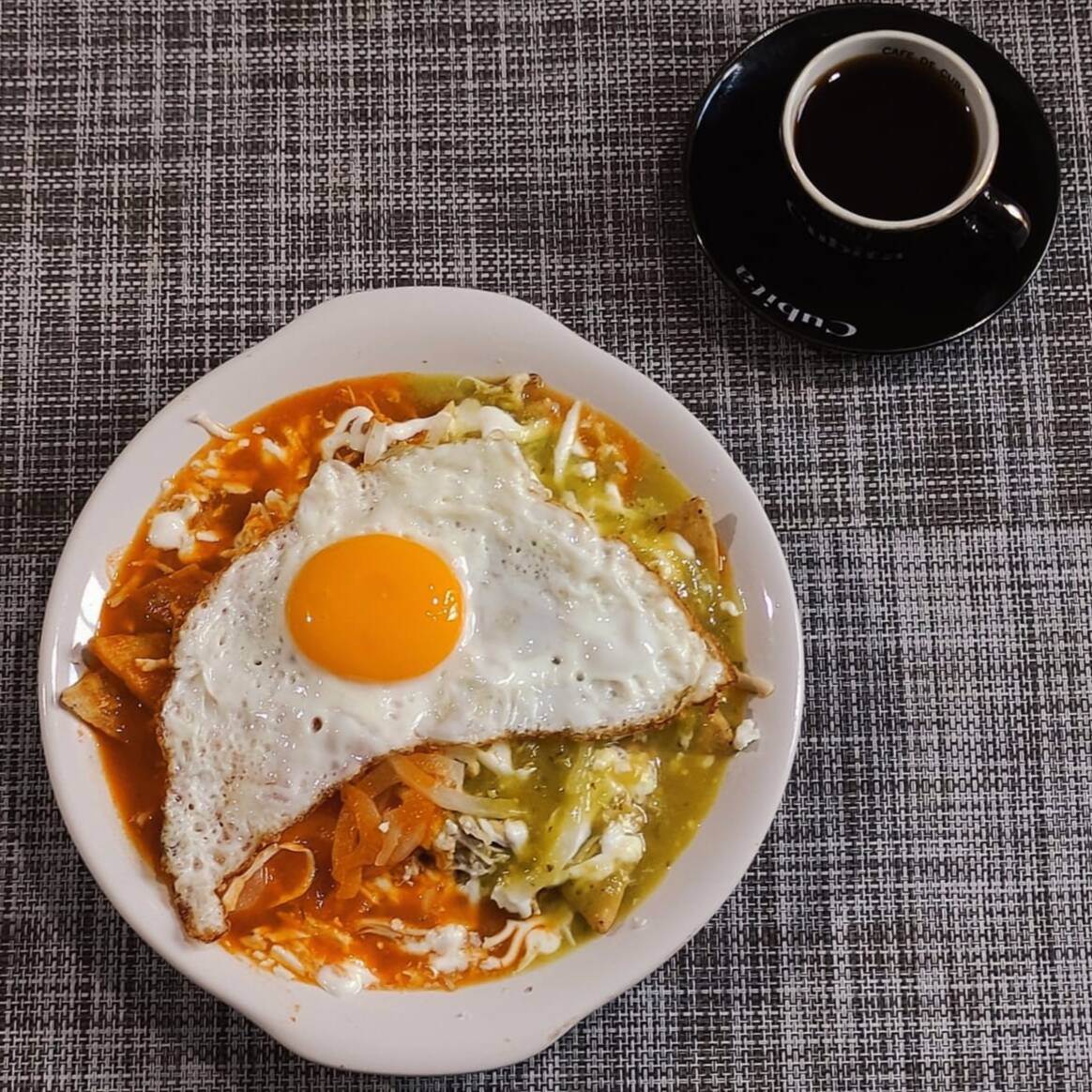 Desayuno mexicano por excelencia, consistente en huevos estrellados sobre tortillas de maíz fritas acompañados de frijol, jamón y queso manchego, bañados en salsa verde por un lado y salsa roja por el otro.