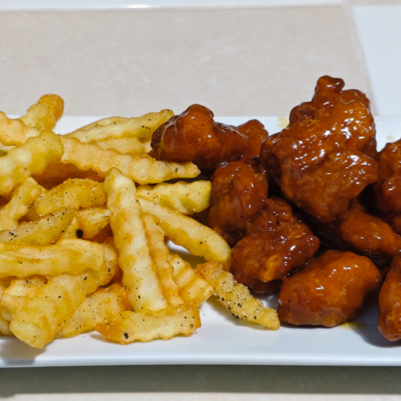 DELICIOSO 1/4 KILO DE BONELESS ACOMPAÑADOS DE CRUJIENTES PAPAS A LA FRANCESA ONDULADAS, (INCLUYE ADEREZO RANCH Y CATSUP).