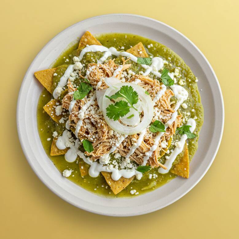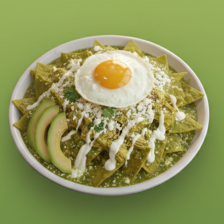 Deliciosos totopos con salsa verde,pollo deshebrado, huevo estrellado, aguacate ,crema,queso fresco espolvoreado y un toque de cebolla y cilantro.