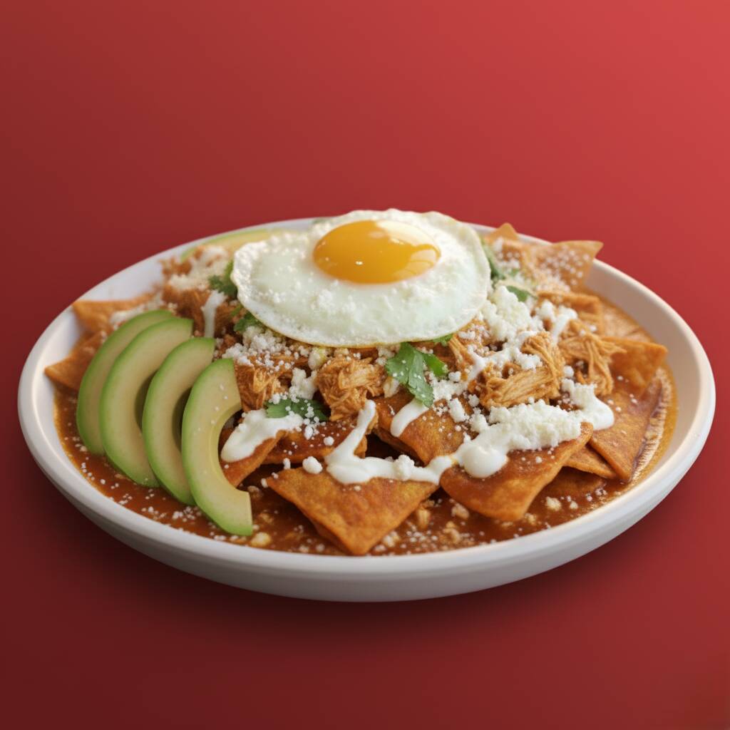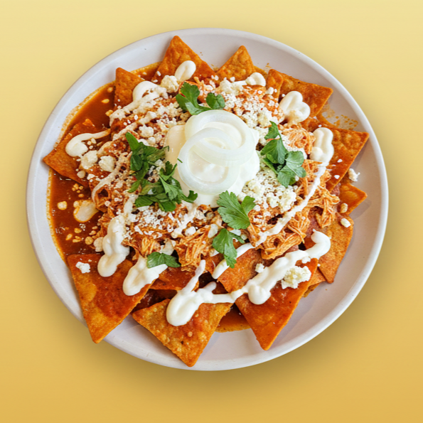 Deliciosos totopos con salsa roja,pollo deshebrado, huevo estrellado, aguacate ,crema,queso fresco espolvoreado y un toque de cebolla y cilantro.