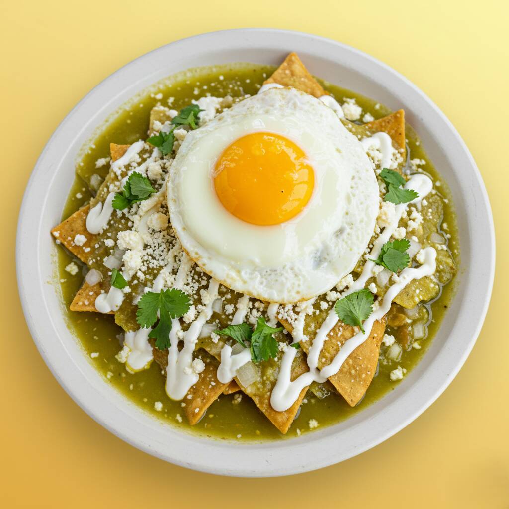 Deliciosos totopos con salsa verde, huevo estrellado,crema,queso fresco desmoronado y un toque de cebolla y cilantro.