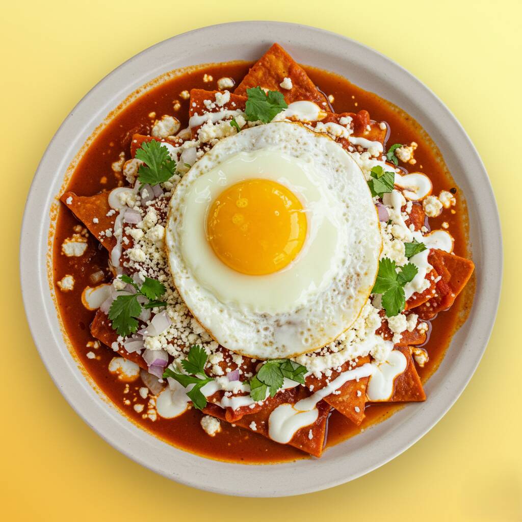 Deliciosos totopos con salsa roja, huevo estrellado,crema,queso fresco desmoronado y un toque de cebolla y cilantro.