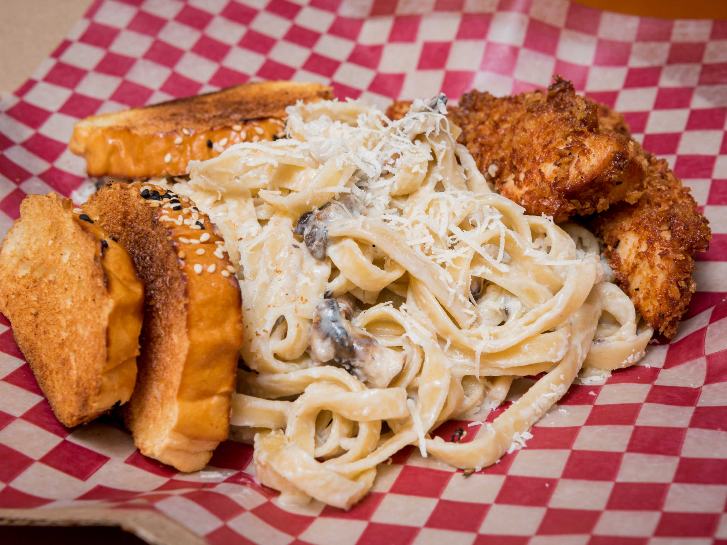 Pasta fetuccini con cremosa salsa alfredo, acompañado de champiñones, tiras de pollo empanizado con pan brioche tostado y queso rayado