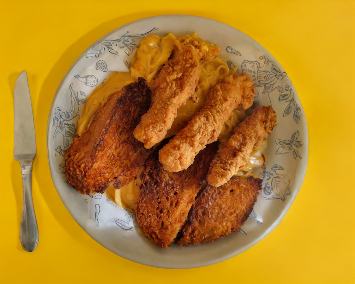 Pasta fetuccini bañada con cremosa salsa bufalo acompañado de tiras de pollo empanizado con pan brioche tostado.