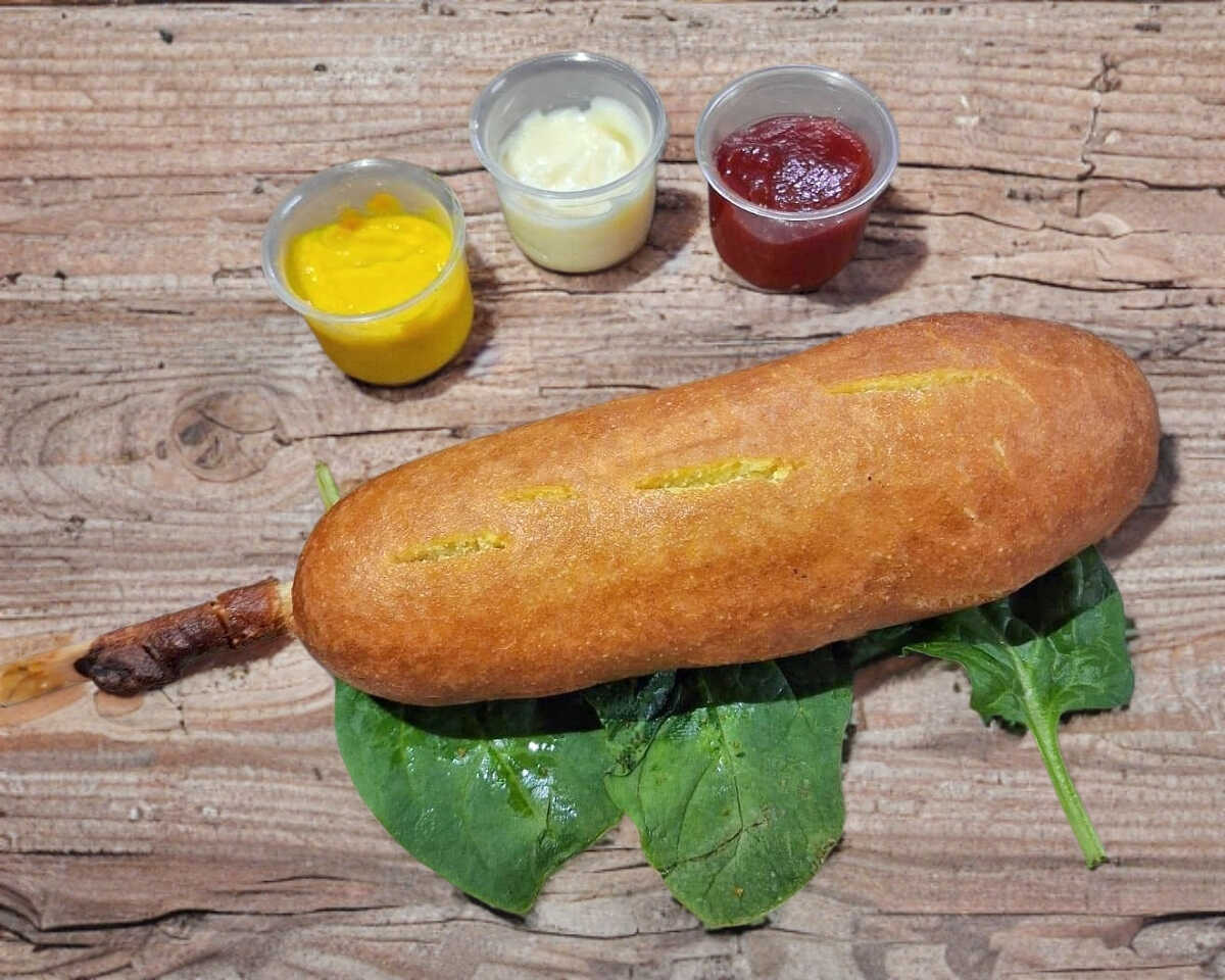 Banderilla crocante con masa suave interna, envolviendo una salchicha suave y rica. Incluye aderezos; ketchup, mostaza y mayonesa. Empaquetado en aluminio y servitoalla para un envio seguro.