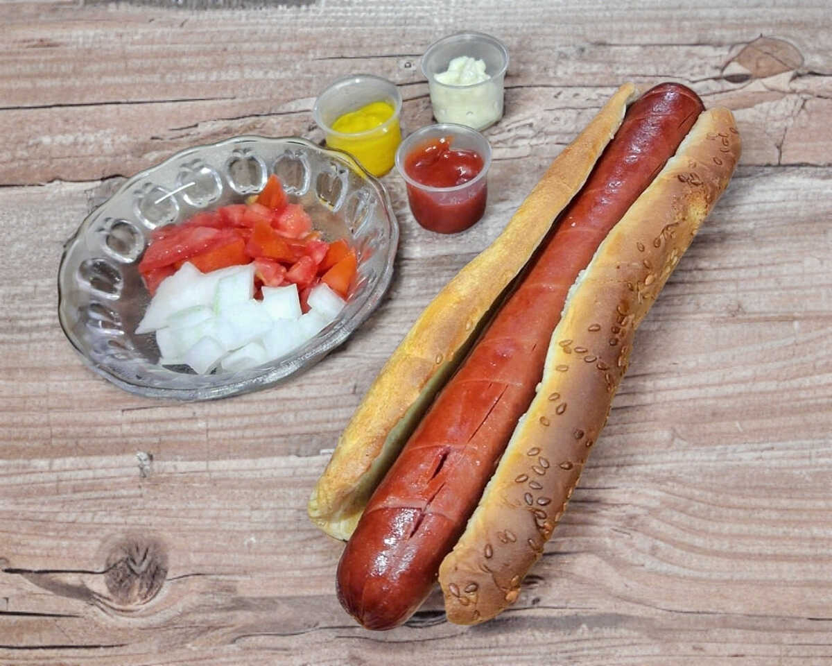 Original Hot Dog de Costco con Complementos: Cebolla, Tomate y chile + Aderezos; Ketchup, mostaza y mayonesa. Enviado y empaquetado en aluminio y servitoalla.