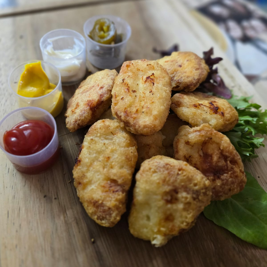 10pz Nuggets Tempura Pilgrim´s de costco acompañado con aderezos y complemento; ketchup, mostaza, mayonesa y jalapeños. Enviado en aluminio, servitoalla y bolsa. Llega caliente, seguro y listo para comer