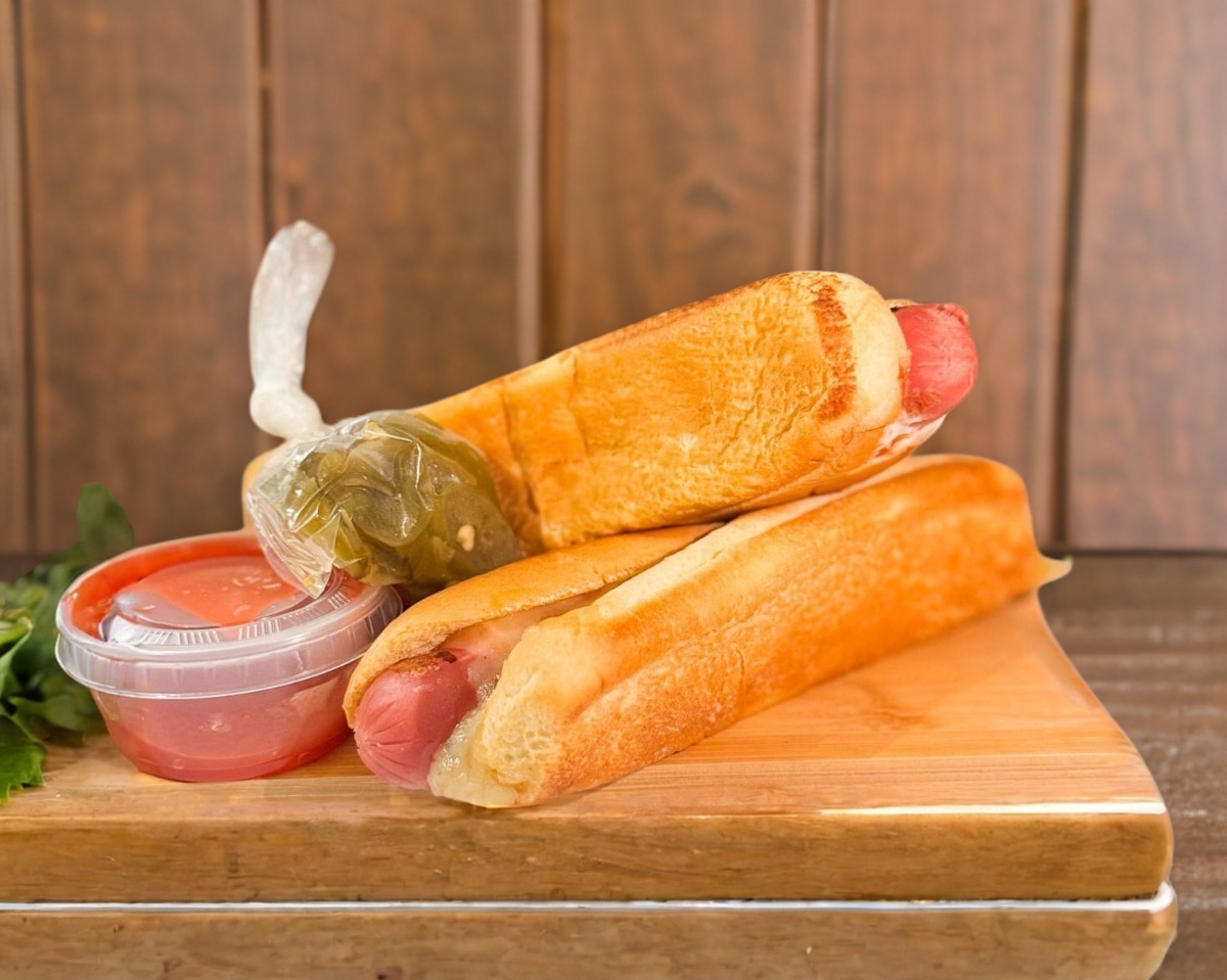 pan suave con salchicha a la plancha y salsas clásicas, gratinado con queso