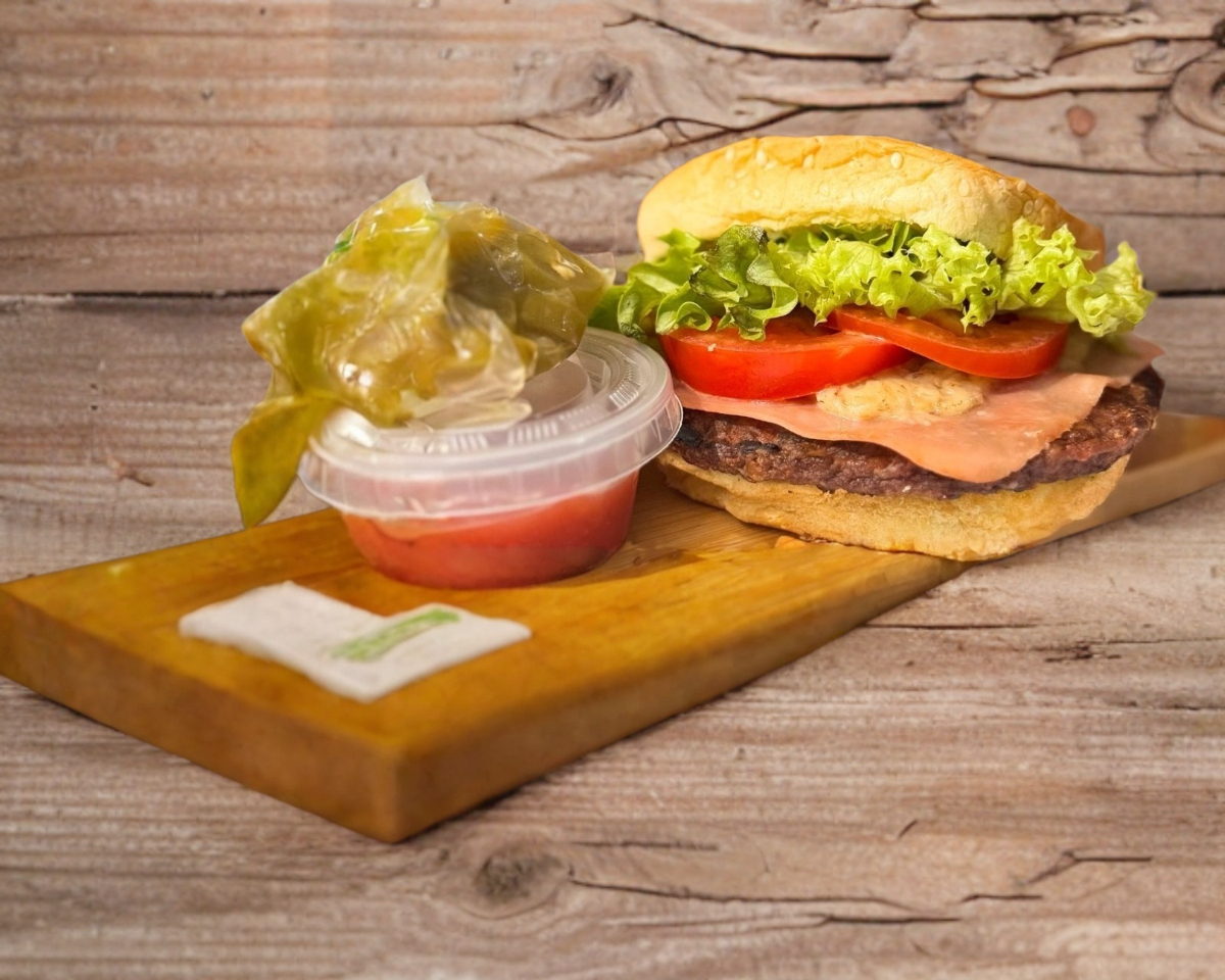 hamburguesa con pollo, queso, jamon, lechuga y aderezos