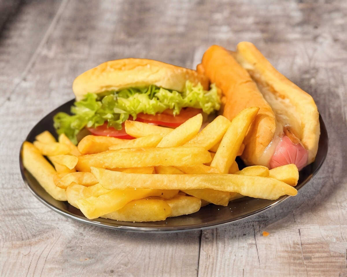 hamburguesa y hotdog con papas gajo o normales perfecto para dos personas