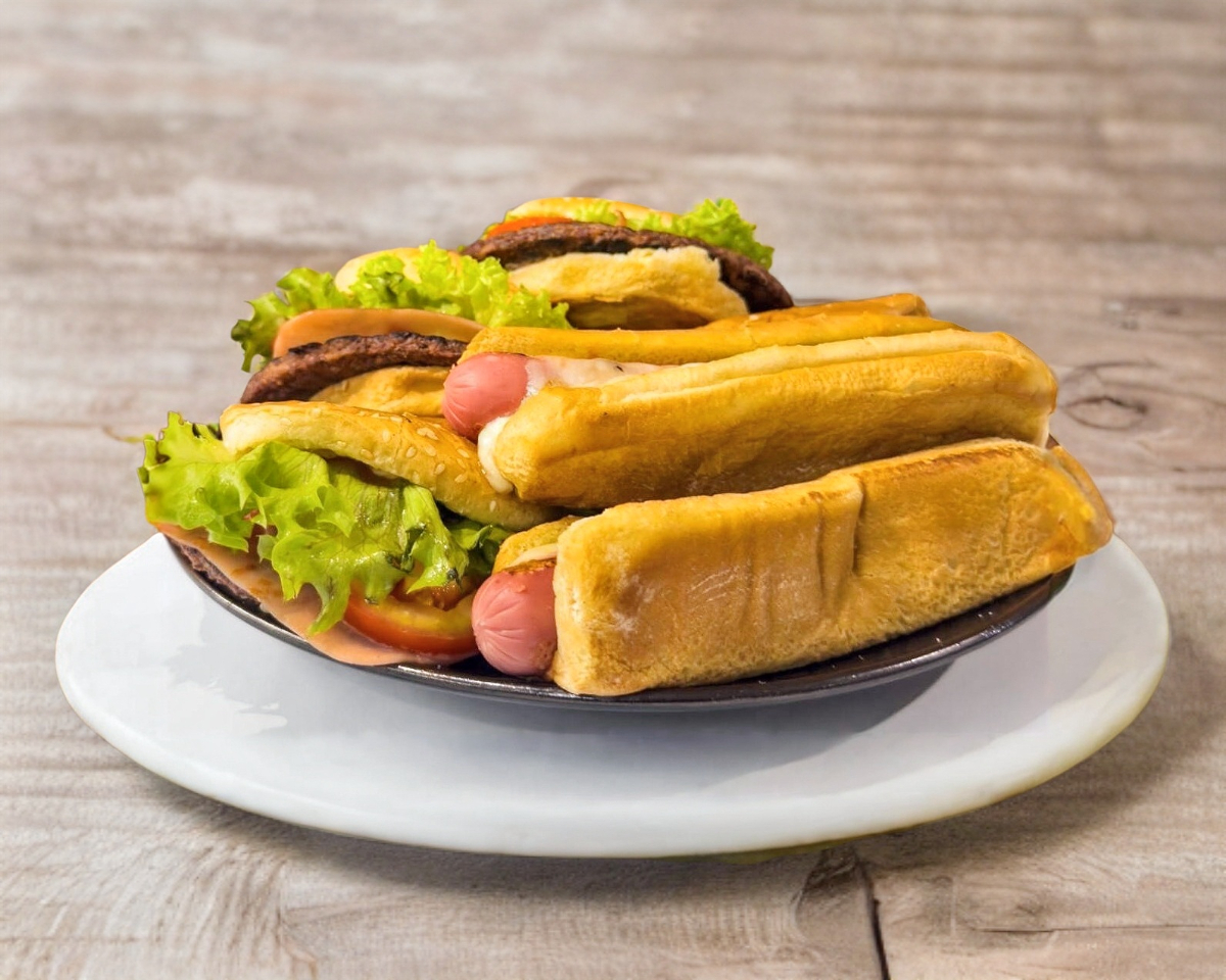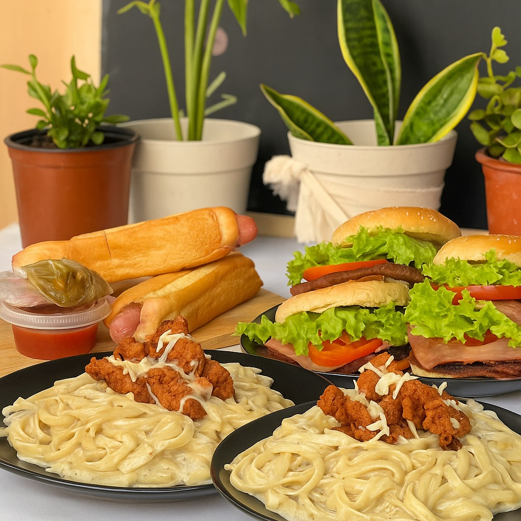 perfecto para el grupo de amigos dos hamburguesas, dos hot dog y dos pastas con aderezos