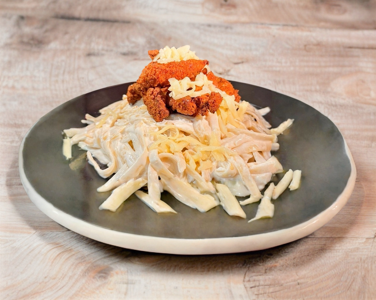 Pasta cremosa de chipotle acompañado de pollo empanizado