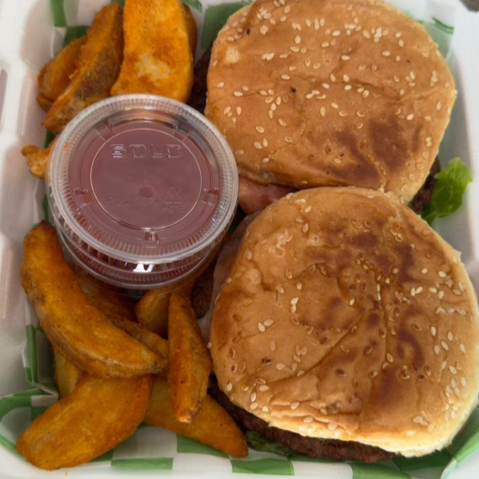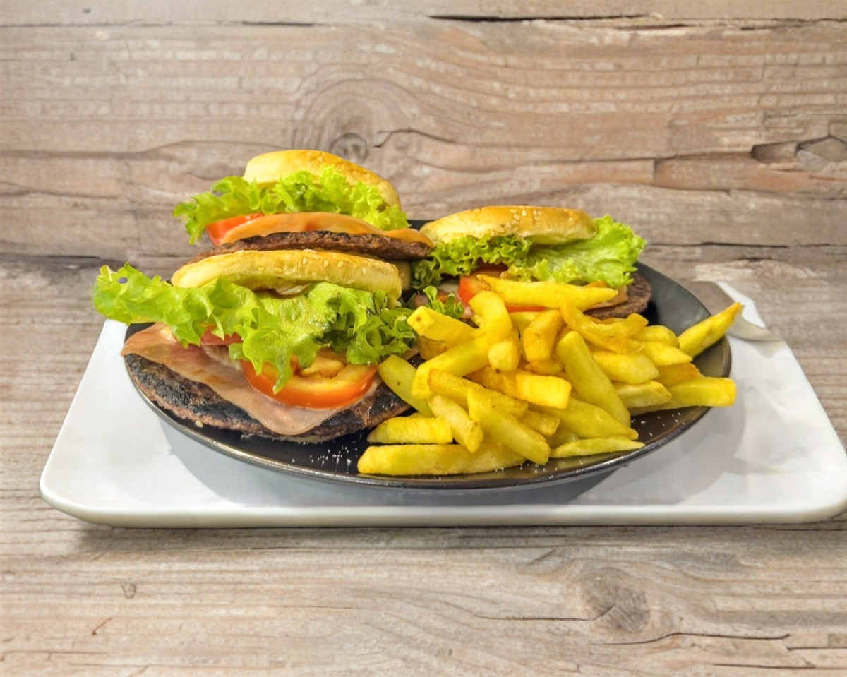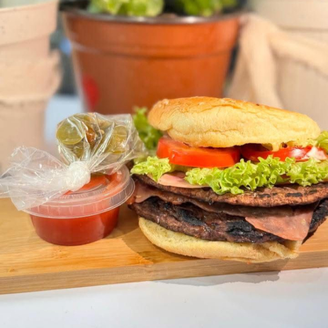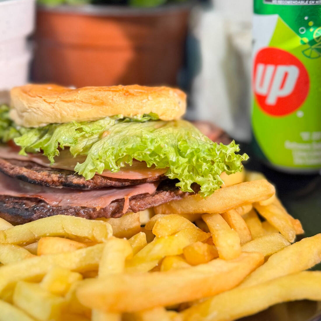 hamburguesa con doble carne, jamon queso, lechuga y aderezos