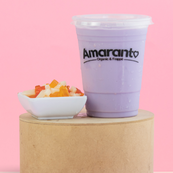 16oz. Nuestro más vendido. Delicioso y cremoso Taro. Crema batida, extras o toppings no incluídos.