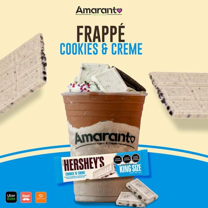 16oz. Frappé con Hershey's cookies & cream, chocolate blanco, oreo y nutella. Crema batida, extras o toppings no incluídos.