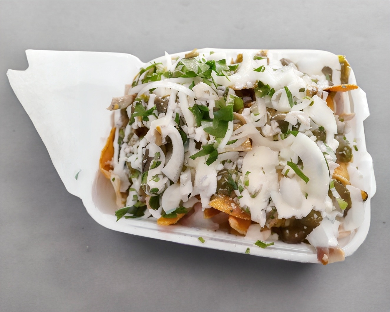 Chilaquiles de salsa verde con pollo desmenuzado, con crema y queso.