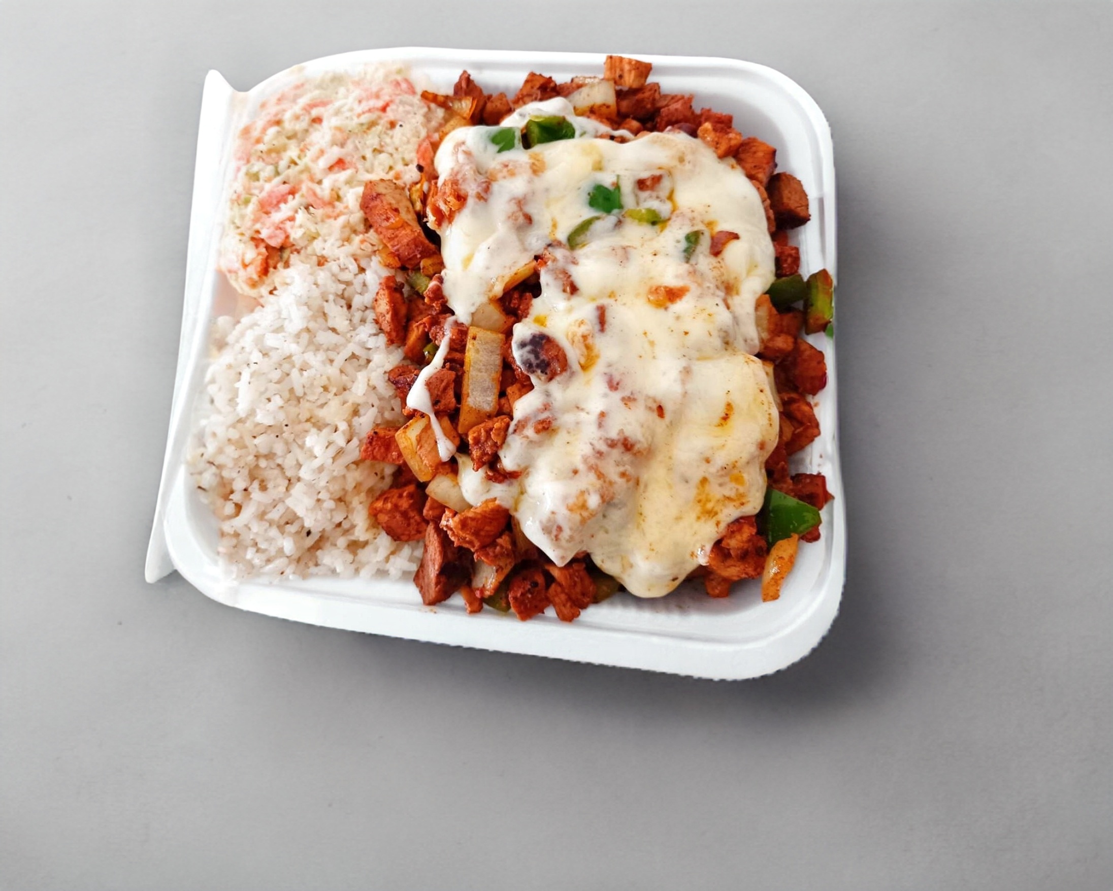 Alambre de carne asada con queso gratinado, incluye arroz blanco y ensalada tipo Kfc, tortillas y salsa habanero kut .