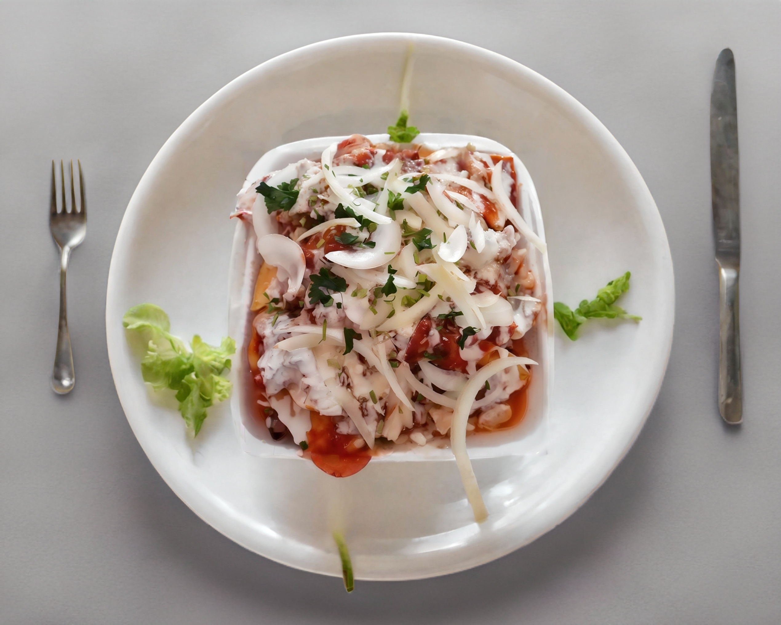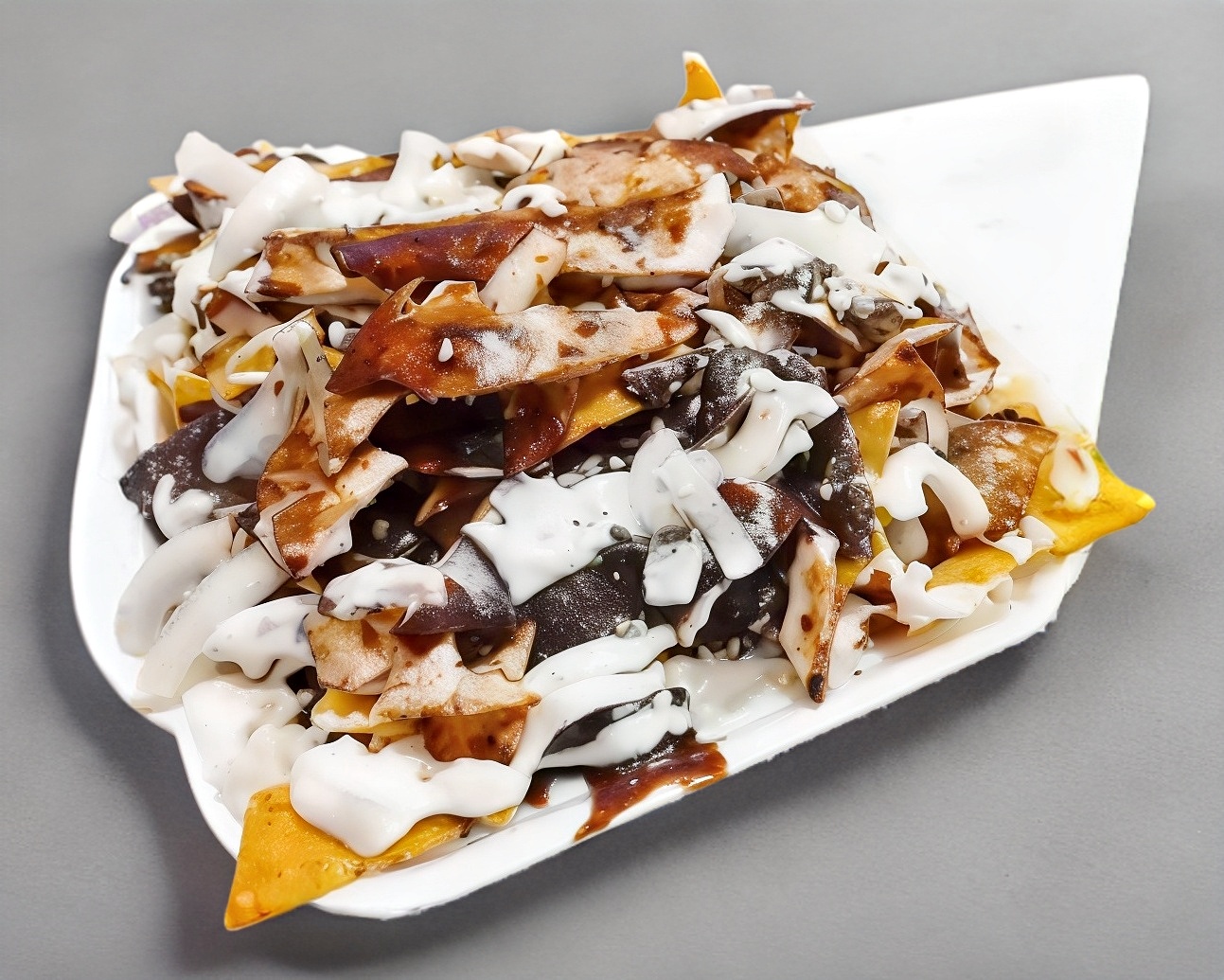 Chilaquiles de mole con tiras de pechuga a la plancha, crema, queso y cebolla.
