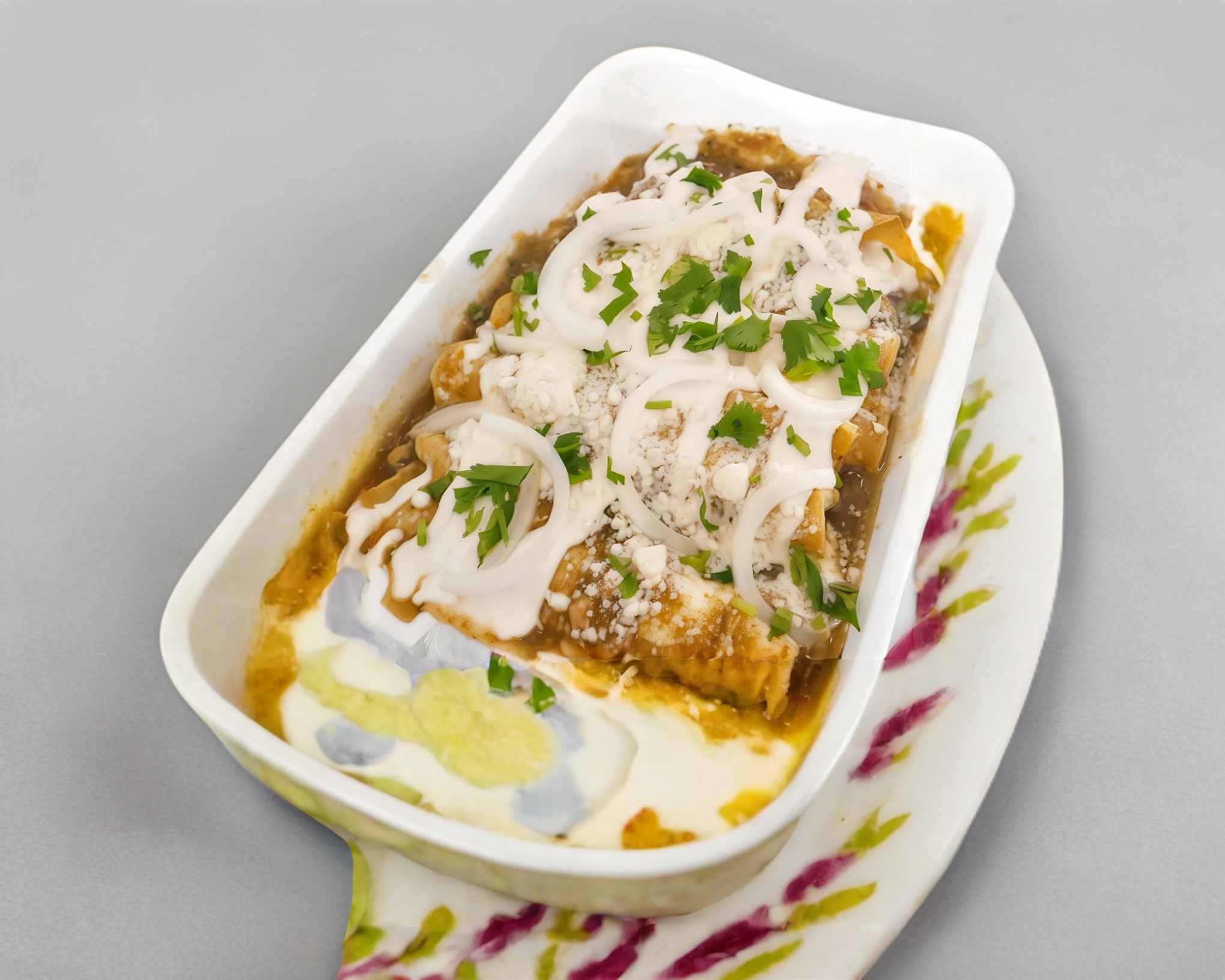 6 piezas de enchiladas de salsa verde rellenas con pollo, crema, queso sopero y cebolla fileteada.