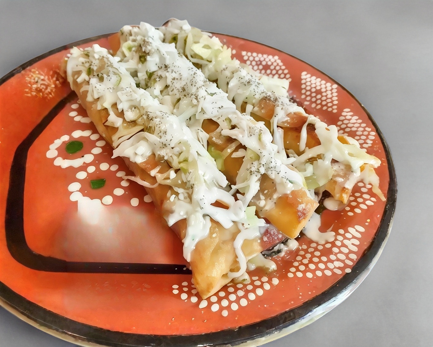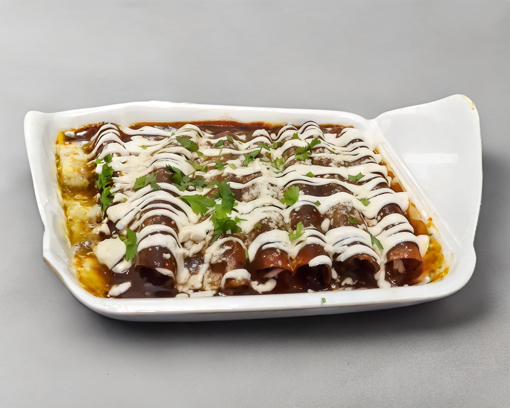 6 Piezas de enchiladas de mole, con pollo desmenuzado, crema, queso y cebolla.