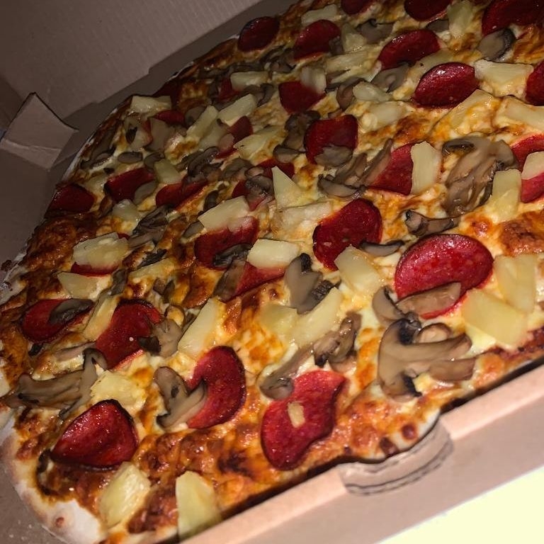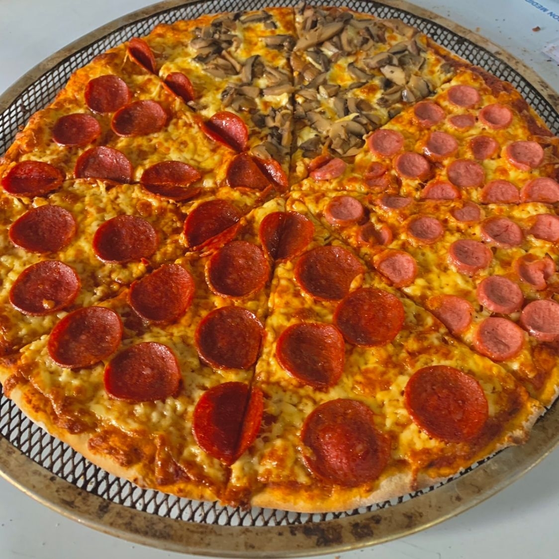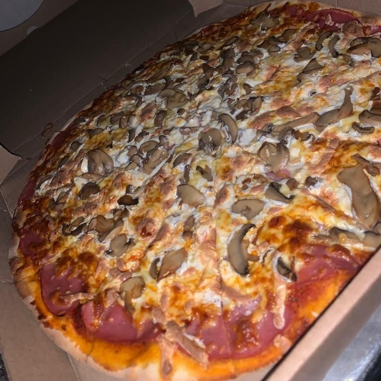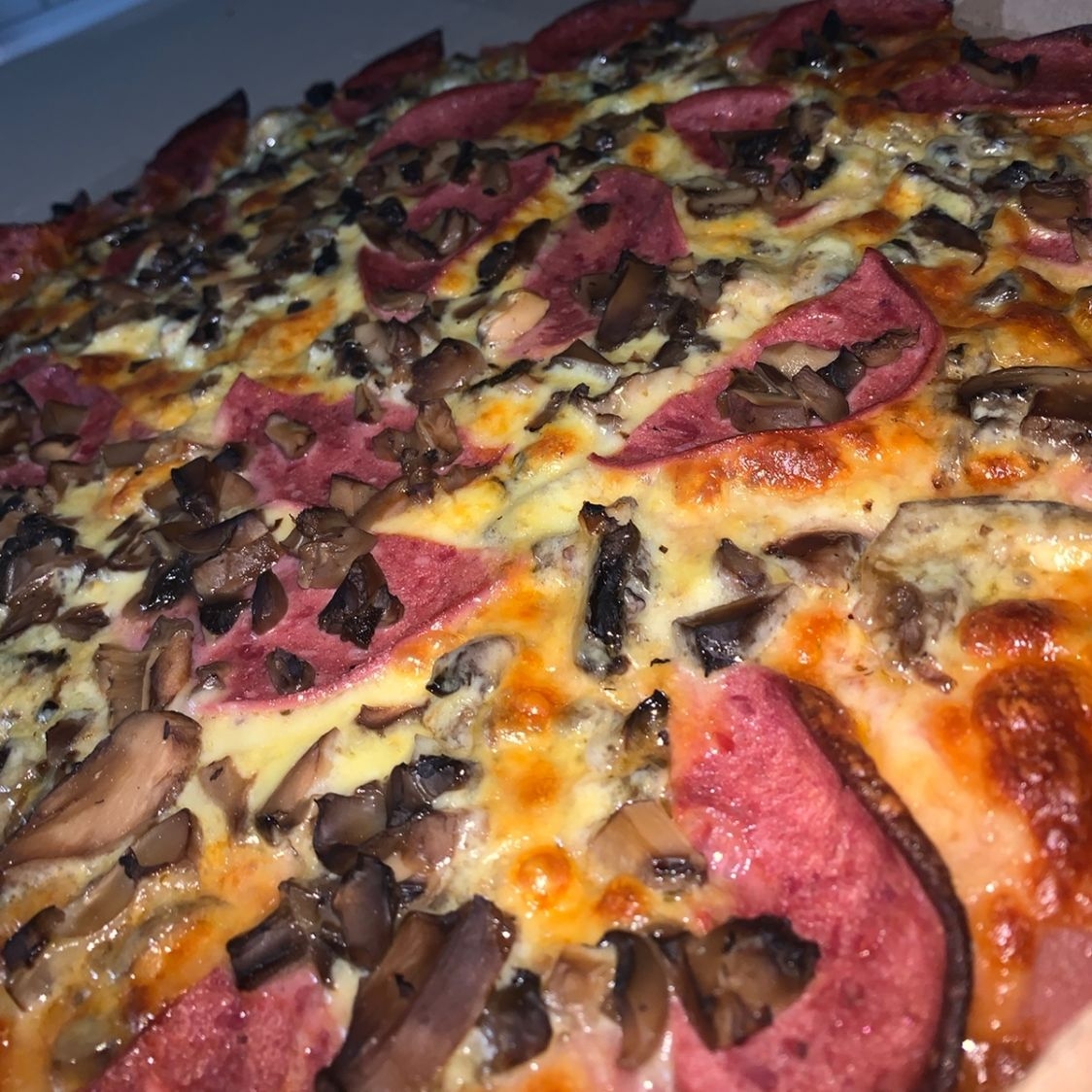 Deliciosa pizza de jamón, pepperoni y champiñón.