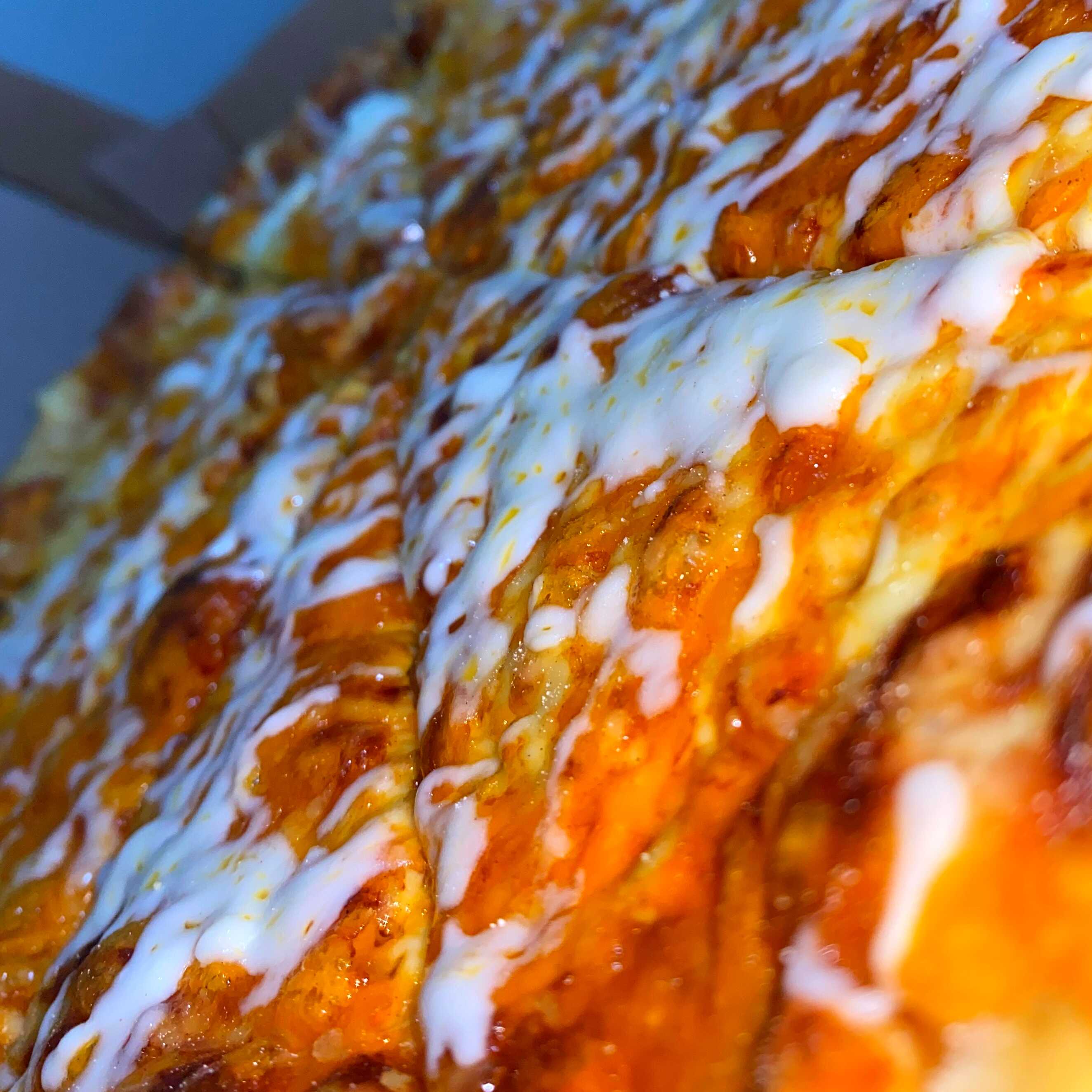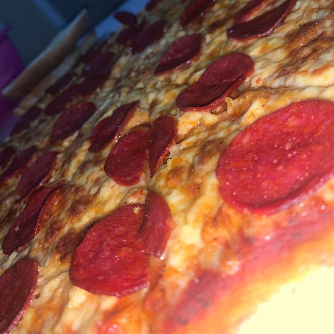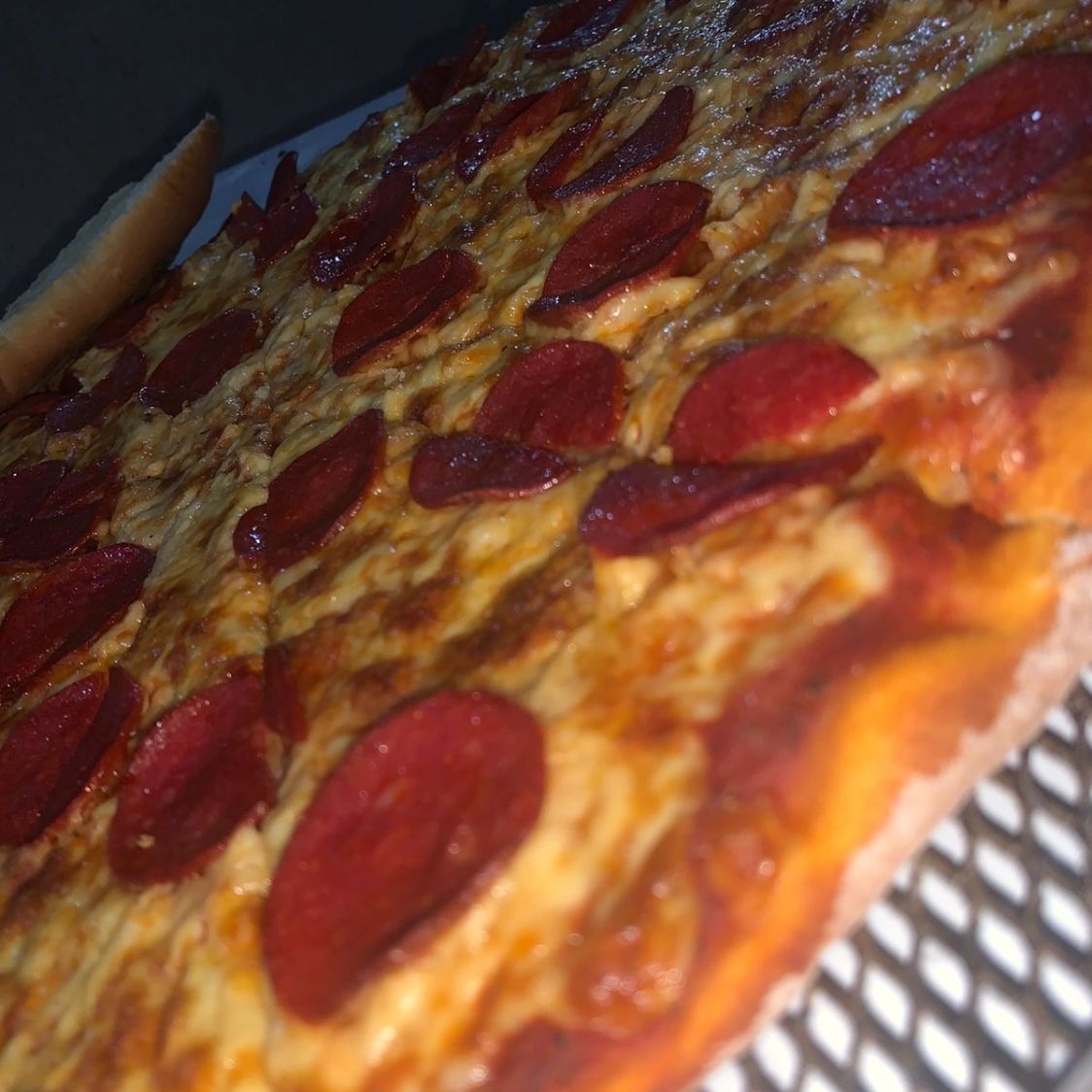 Deliciosa pizza de orilla 1/2 Philadelphia, 1/2 manchego de queso hebra, jamón, pepperoni y Philadelphia.