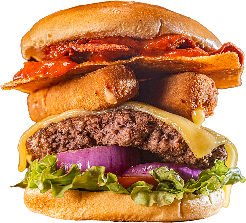 Jugosa hamburguesa 100% de res con una cantidad asombrosa de tocino crujiente, acompañada de aros de cebolla de la casa con queso Monterrey y queso Gouda.