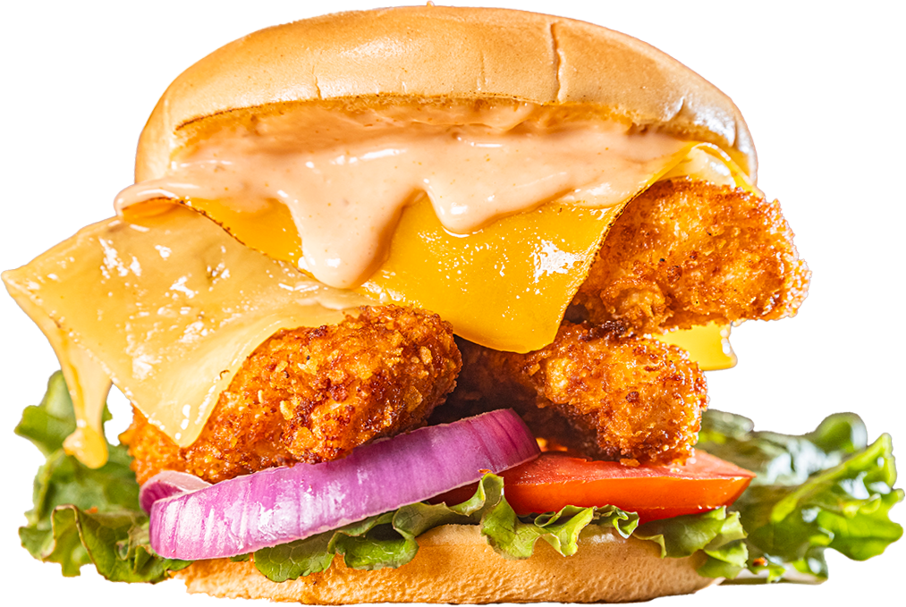 HAMBURGUESA DE TIRAS DE POLLO CRISPY CON QUESO GOUDA Y QUESO AMERICANO DERRETIDO Y SALSA RELISH, ACOMPAÑADA DE VEGETALES FRESCOS.