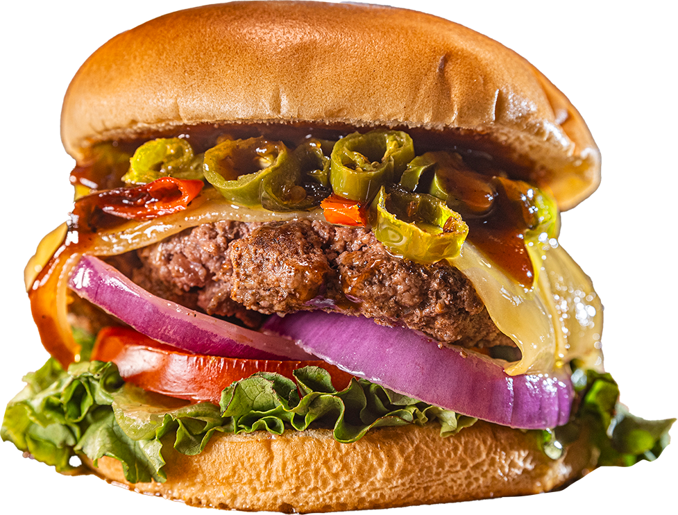 JUGOSA HAMBURGUESA DE 150GR DE CARNE DE RES BAÑADA EN QUESO GOUDA ACOMPAÑADA DEL DELICIOSO SABOR DE LOS CHILES SERRANOS TOREADOS CON UN TOQUE DE NUESTRAS SALSAS RELISH Y BBQ, ACOMPAÑADA DE VEGETALES.