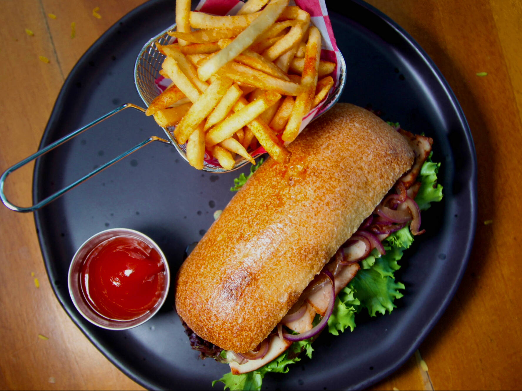 Carne de libre pastoreo, espinaca, jitomate, brotes de mostaza, queso menonita, mermelada de tocino, mayonesa de ajo rostizado y chipotle.