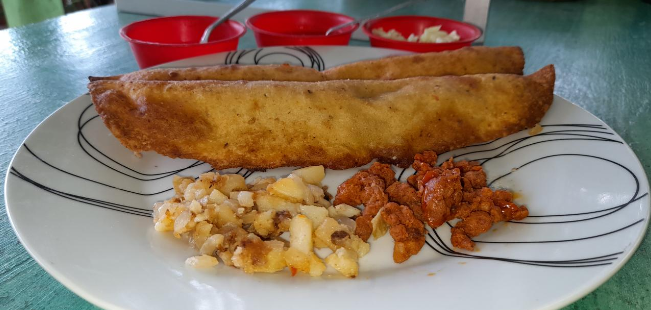 Rellena de chorizo, frijol y queso.