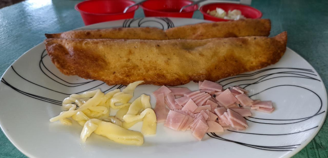Rellena de chorizo, jamón y queso.