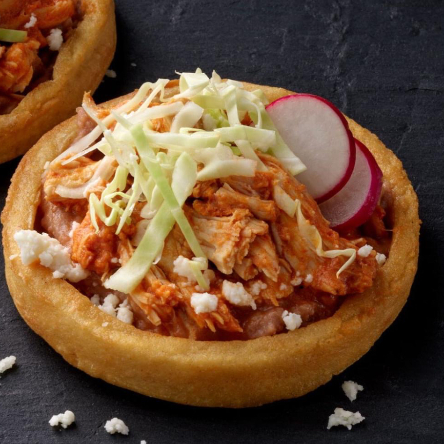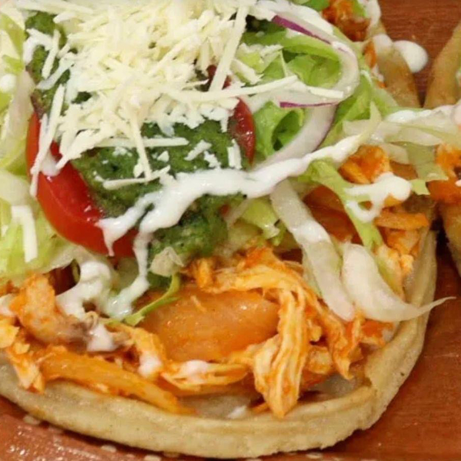 Sope de Tinga de Pollo con frijol, romanita, media crema, cebolla asada, y salsa verde