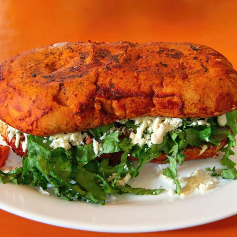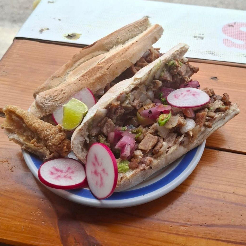 Pambazo de papa con chorizo, frijol, romanita, queso sopero, salsa verde y media crema