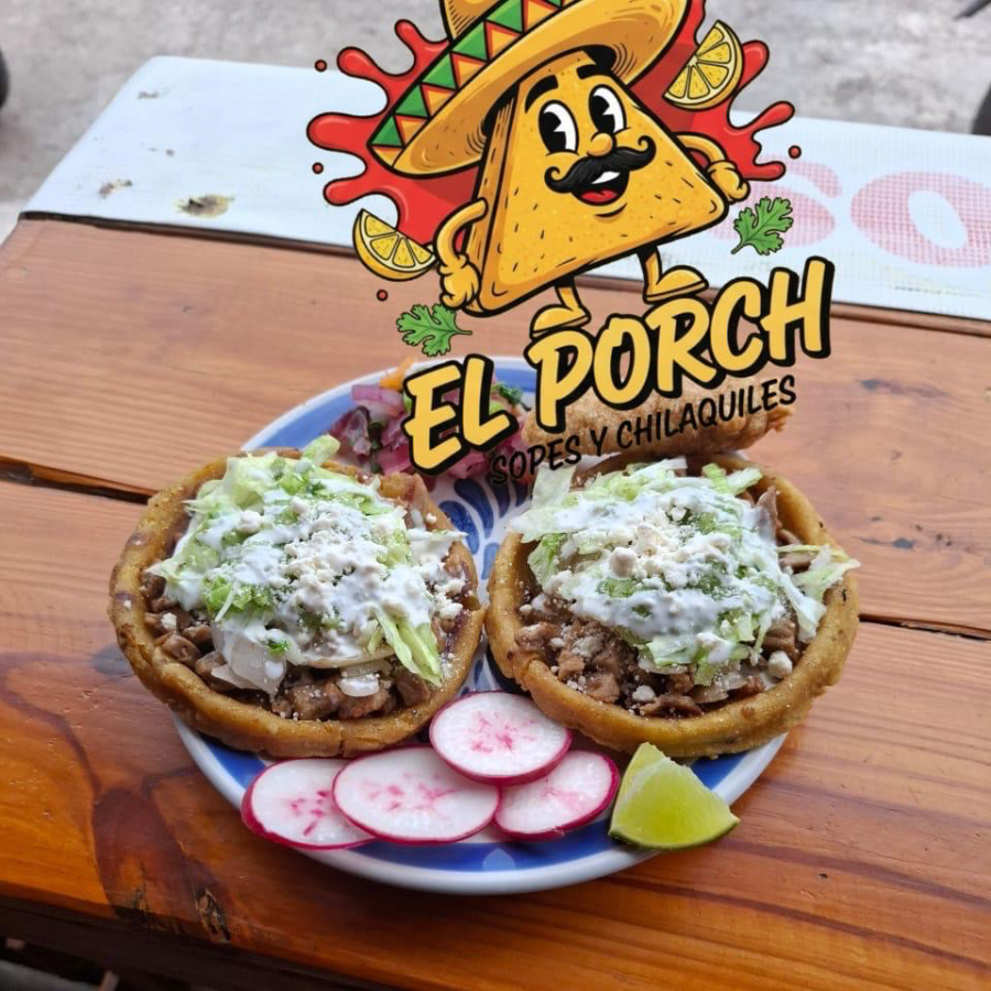 Sope de papa con chorizo con frijol, romanita, media crema, cebolla asada y salsa verde
