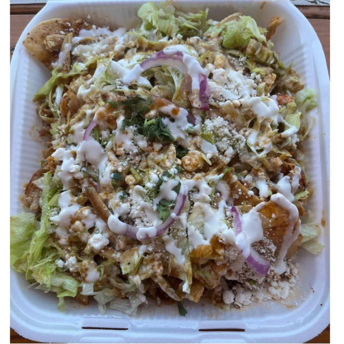Totopos bañados en salsa roja con queso, crema, cebolla y romanita