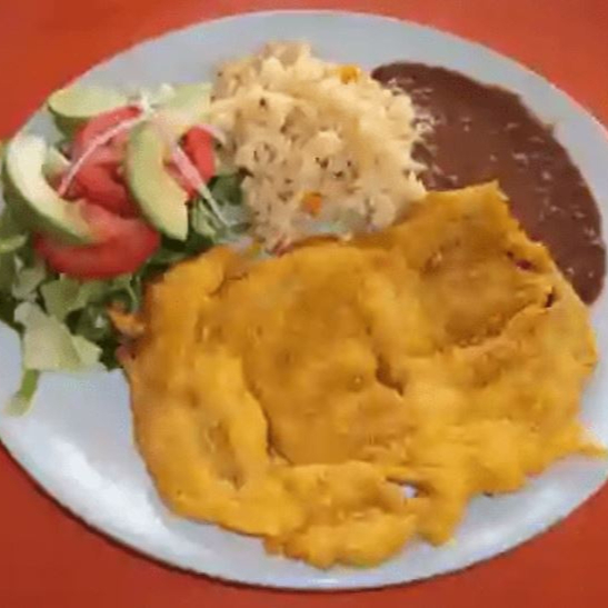Pechuga de pollo, ya sea a la plancha o empanizada, con un delicioso sabor. Acompañada de arroz, ensalada de vegetales, frijolitos colados y tortillas.