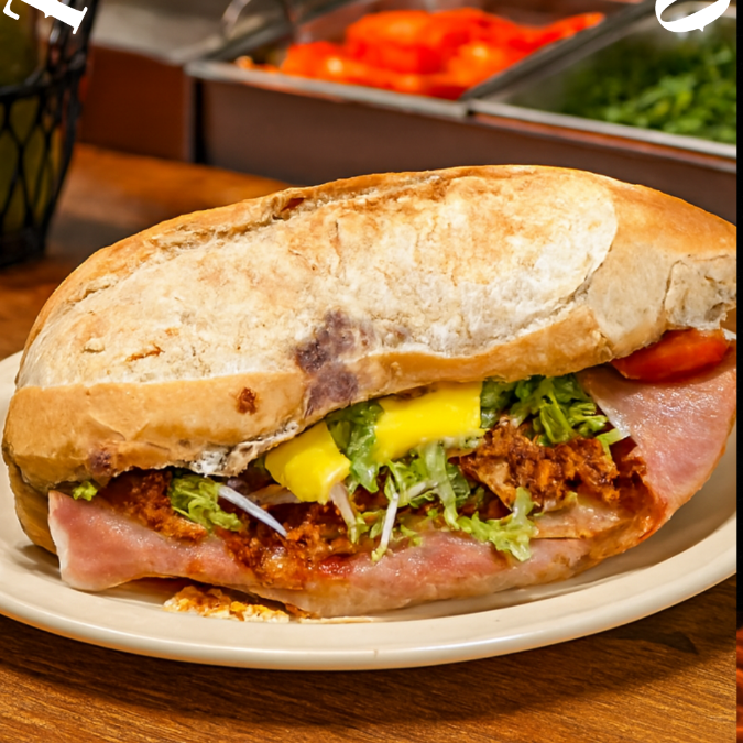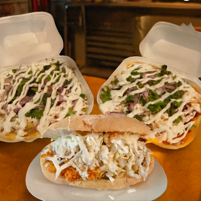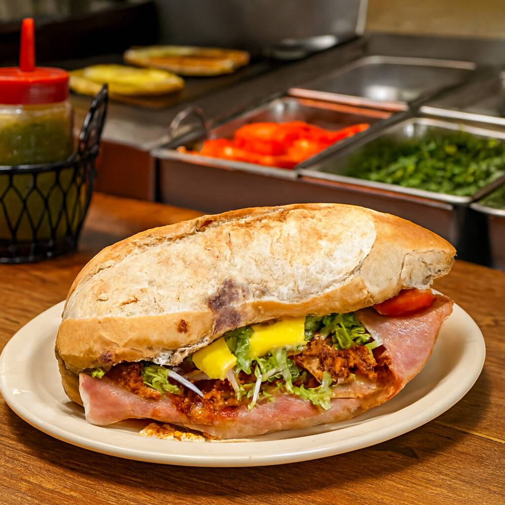 Deliciosa torta de doble bolillo, base de frijol, carne asada roja, chorizo, jamon, queso, salchicha, salchicha para asar y huevo, acompañada de tomate, lechuga cebolla y aguacate