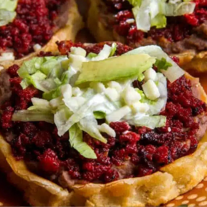 Sope con base de frijol rellenos de chicharron prensado rojo