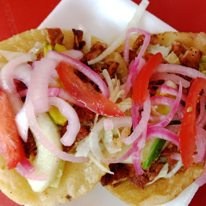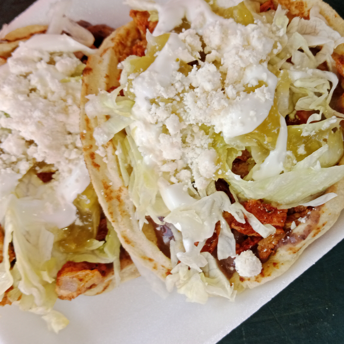 tortilla echa a mano al momento, con frijol, carne (asada, molida, pollo) salsa verde, media crema y queso