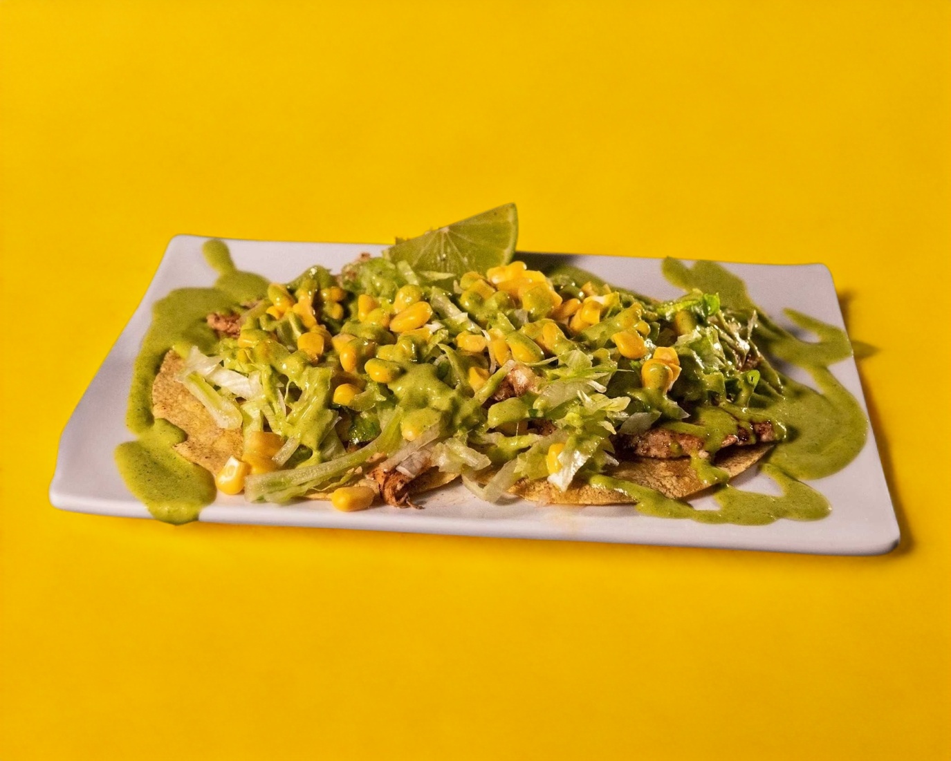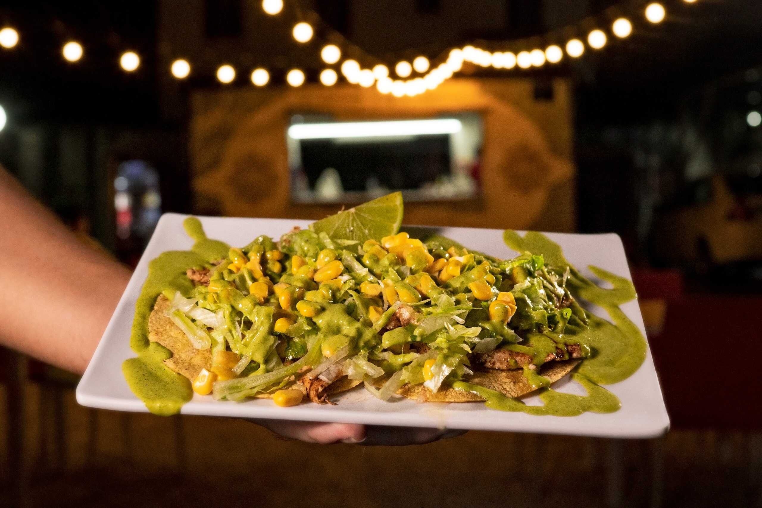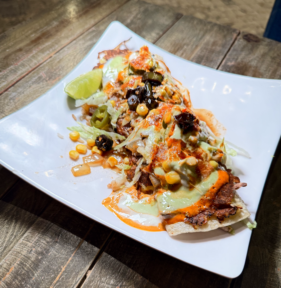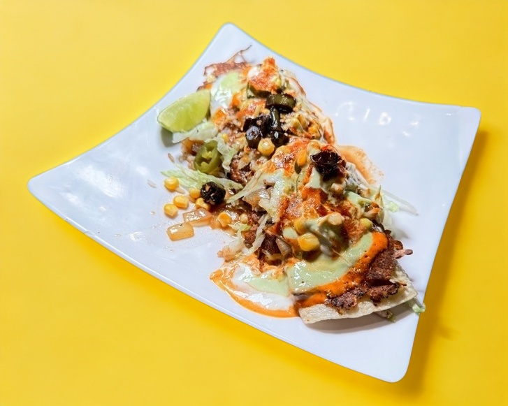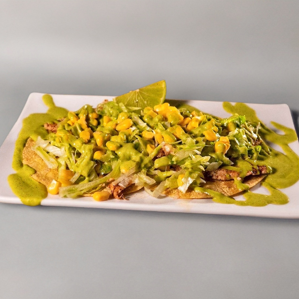 Totopos de maíz fritos con base de frijol, proteína a elegir.