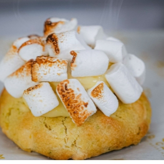 Toque de limón, chocolate blanco, por arriba salsa de limón y malvaviscos