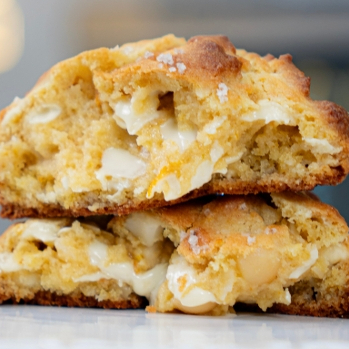 Chocolate blanco, trocitos de macadamia y naranja