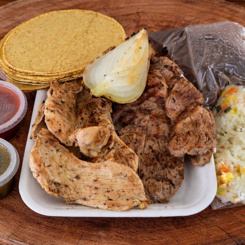 250 GRAMOS DE POC CHUC + 250 GRAMOS DE PECHUGA DE POLLO AL CARBÓN + COMPLEMENTOS (TORTILLA, 1/2 CEBOLLA ASADA,SALSA DE TOMATE, PICANTE, ARROZ Y FRIJOL COLADO)