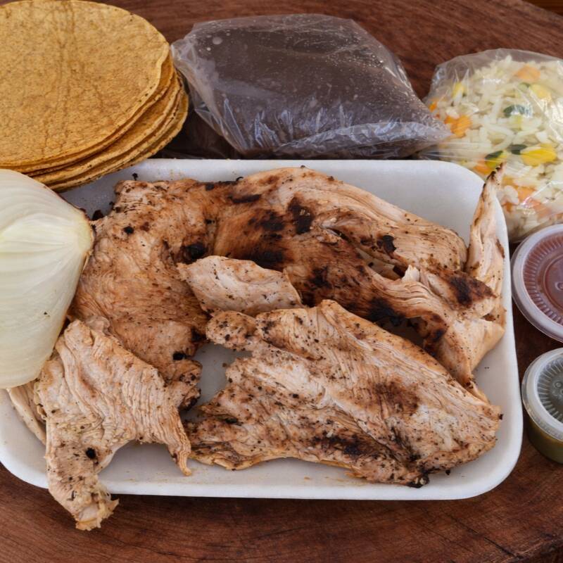 1 KILOGRAMO DE PECHUGA DE POLLO AL CARBÓN + COMPLEMENTOS (TORTILLA, 1 CEBOLLA ASADA,SALSA DE TOMATE, PICANTE, ARROZ Y FRIJOL COLADO)