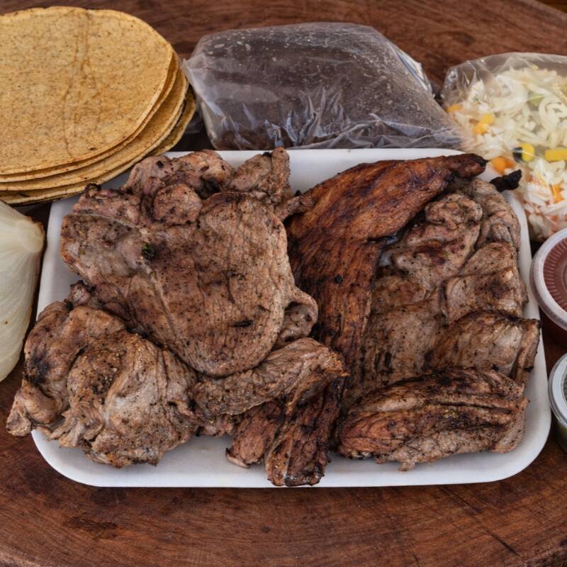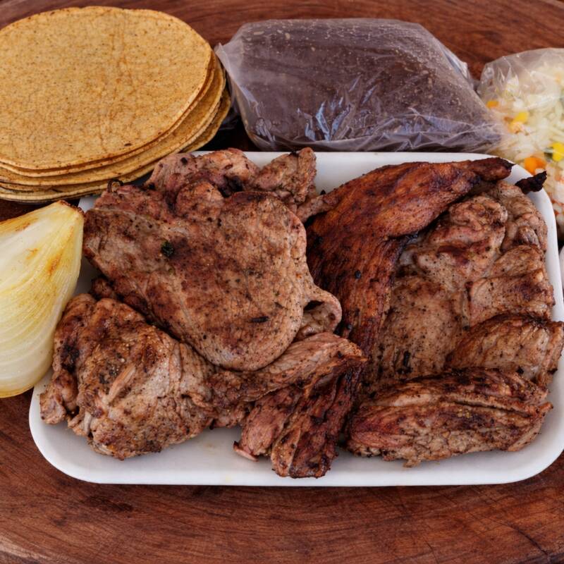 1 KILOGRAMO DE POC CHUC AL CARBÓN + COMPLEMENTOS (TORTILLA, 1 CEBOLLA ASADA,SALSA DE TOMATE, PICANTE, ARROZ Y FRIJOL COLADO)